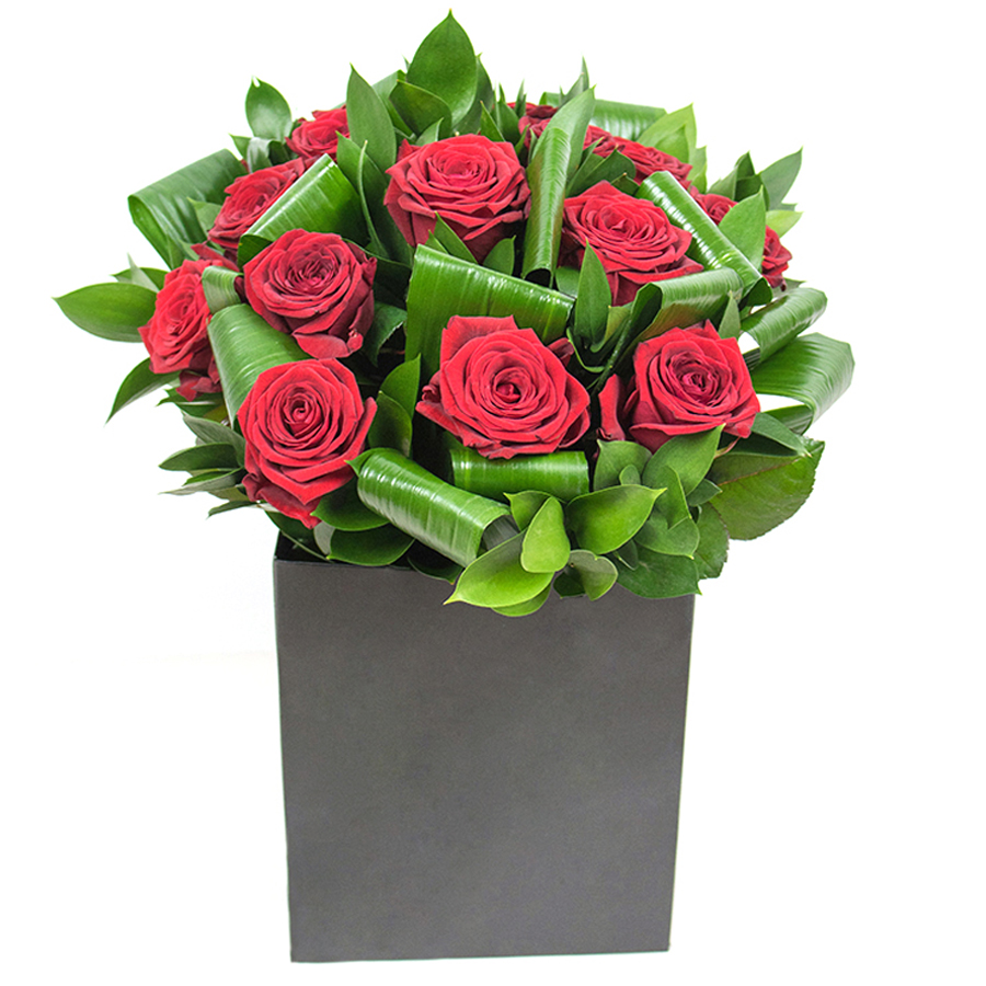 Indulge in the lavish beauty of our bouquet, featuring deep red roses paired with rich aspidistra leaves and lush ruscus. This unique arrangement brings sophistication and elegance to any environment.